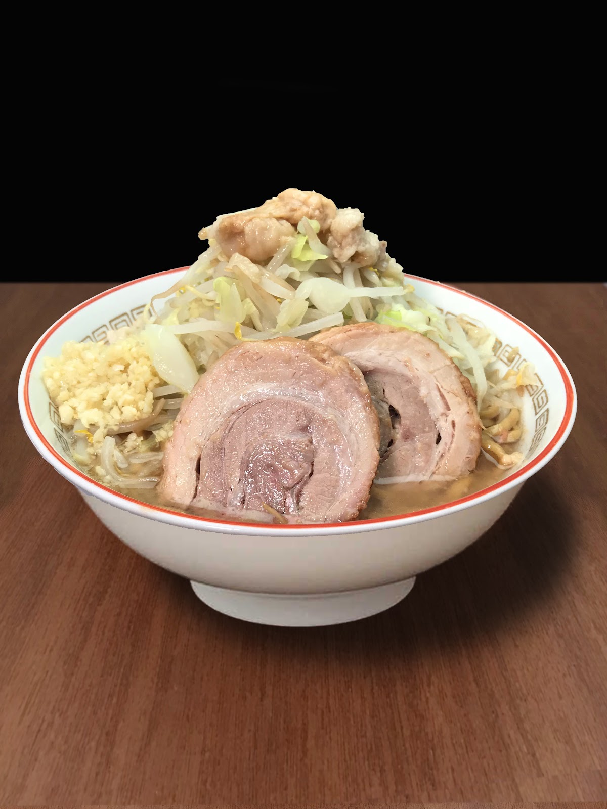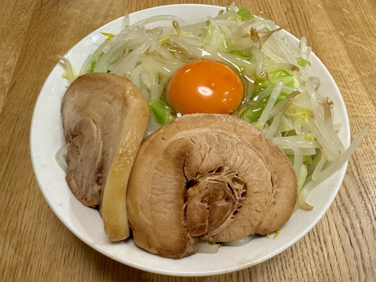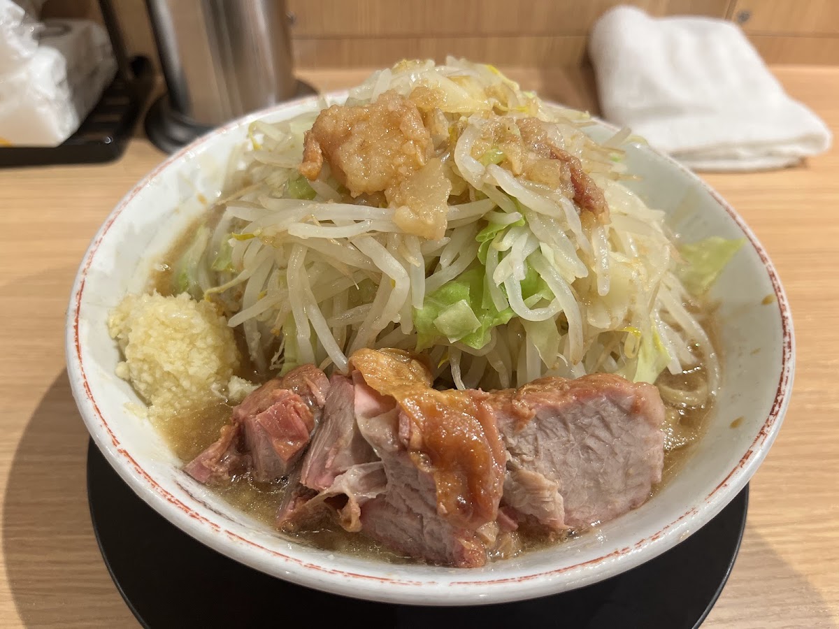 看板メニューの豚骨醤油ラーメンは、乳化した濃厚な豚骨醤油スープが特徴で、太麺がワシワシ系でスープとよく絡みます。野菜・ニンニク・脂・辛さの量を調整可能で、店内には分かりやすいコール説明が書かれているため、初めての方でも安心して注文できます。「スープはしっかり濃厚でパンチがあり、王道の二郎系という印象。麺もワシワシ系で食べ応えがあり、ボリュームはさすが」とのお客様の声が寄せられています。